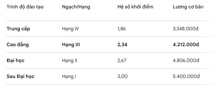 • Giai đoạn khởi đầu (Bậc 1 – Hệ số 2,34): Mức lương căn bản rơi vào khoảng 4.212.000 đồng/tháng;